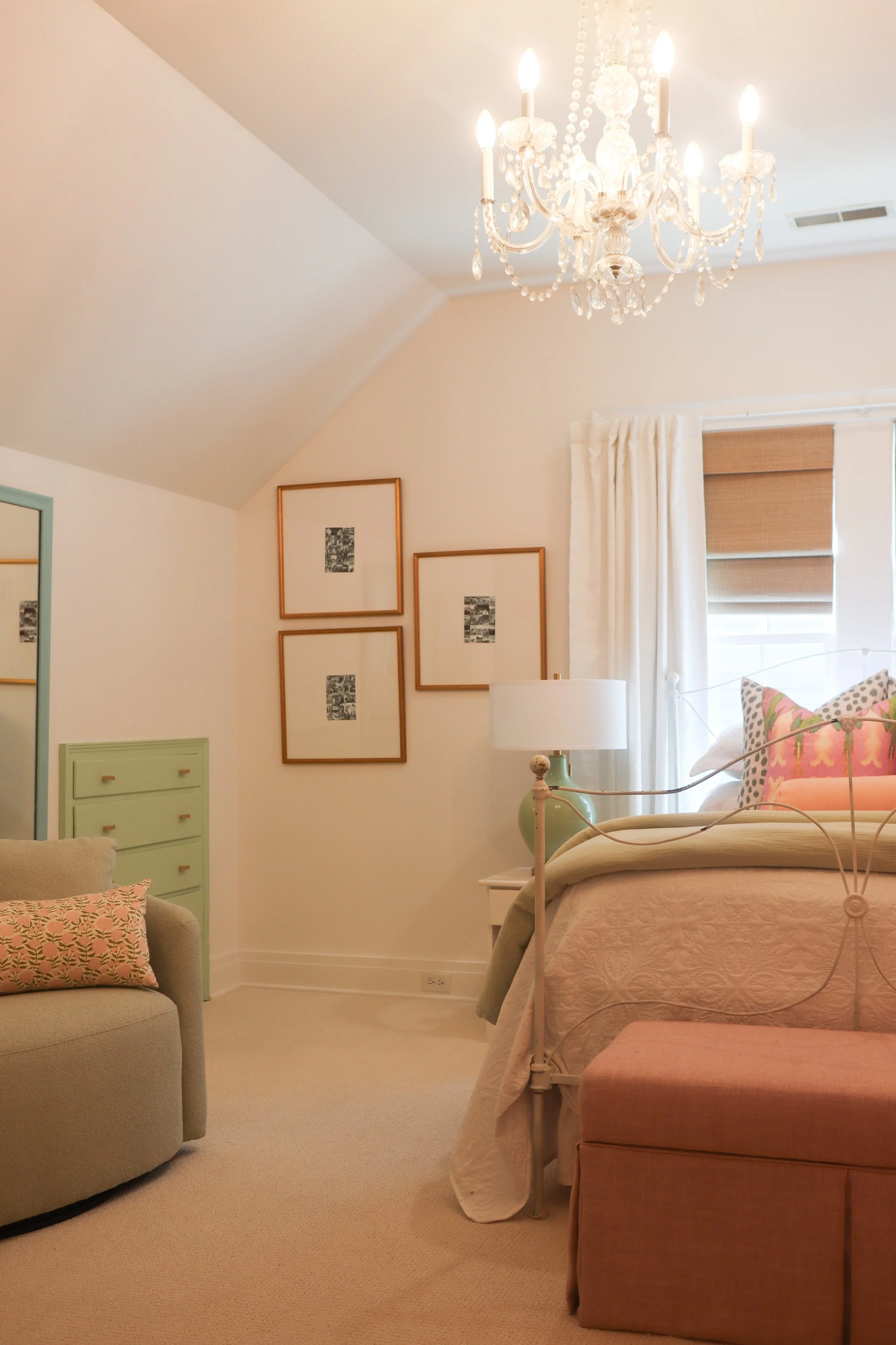 FROM CHILDHOOD ROOM TO ELEGANT GUEST BEDROOMThis green and pink bedroom redesign in Nashville started with a full declutter and organization session to help transform the space from a childhood room into a functional, beautiful guest bedroom. After clearing out years of clutter, I was hired back to completely redesign the room. This client wanted to maintain the original pink and green color palette, but elevate it to feel more sophisticated, stylish, and grown-up. The result is a cozy and welcoming space that honors the homeowner's memories while working perfectly for their daughter’s new chapter as a college graduate.