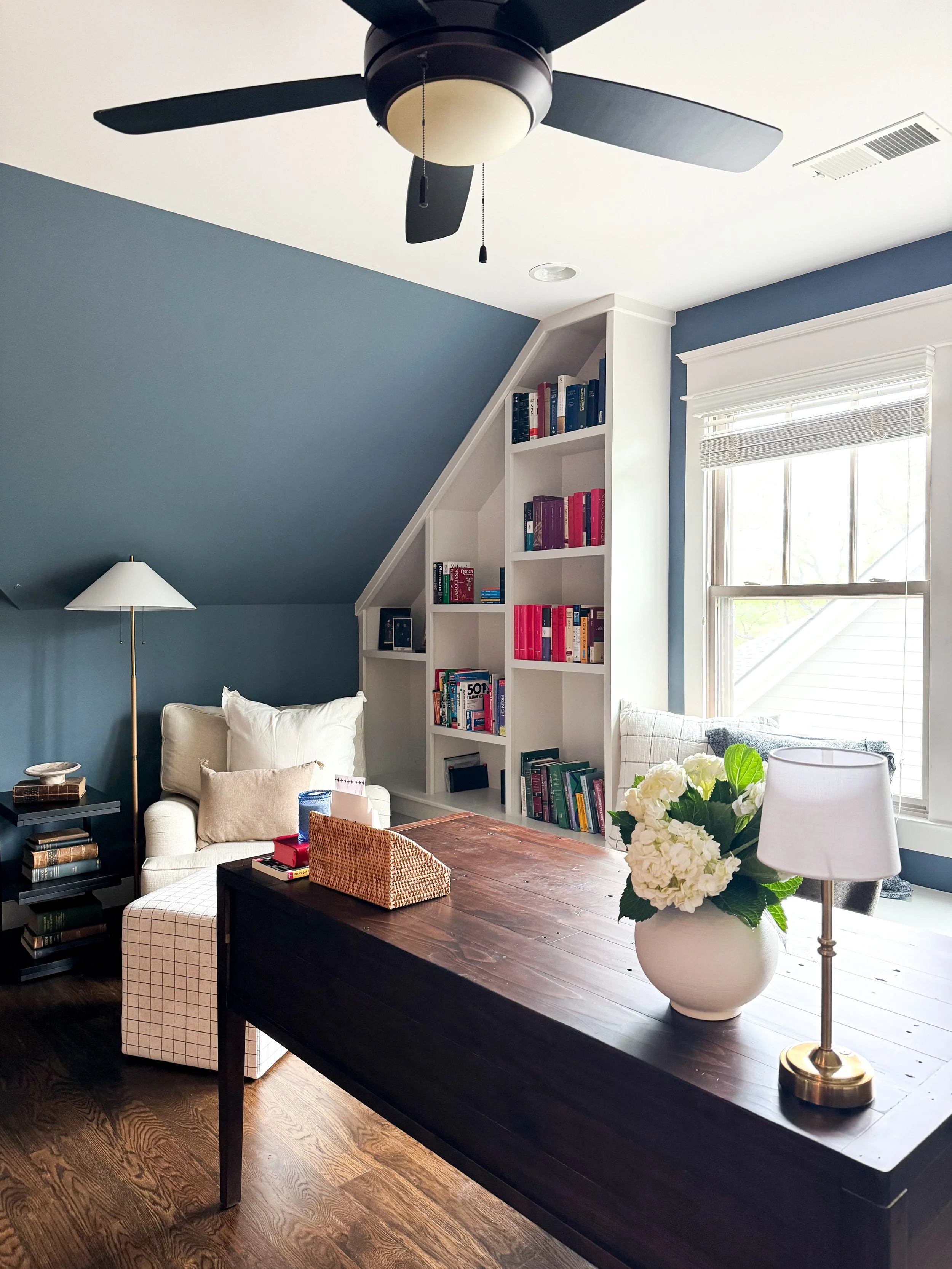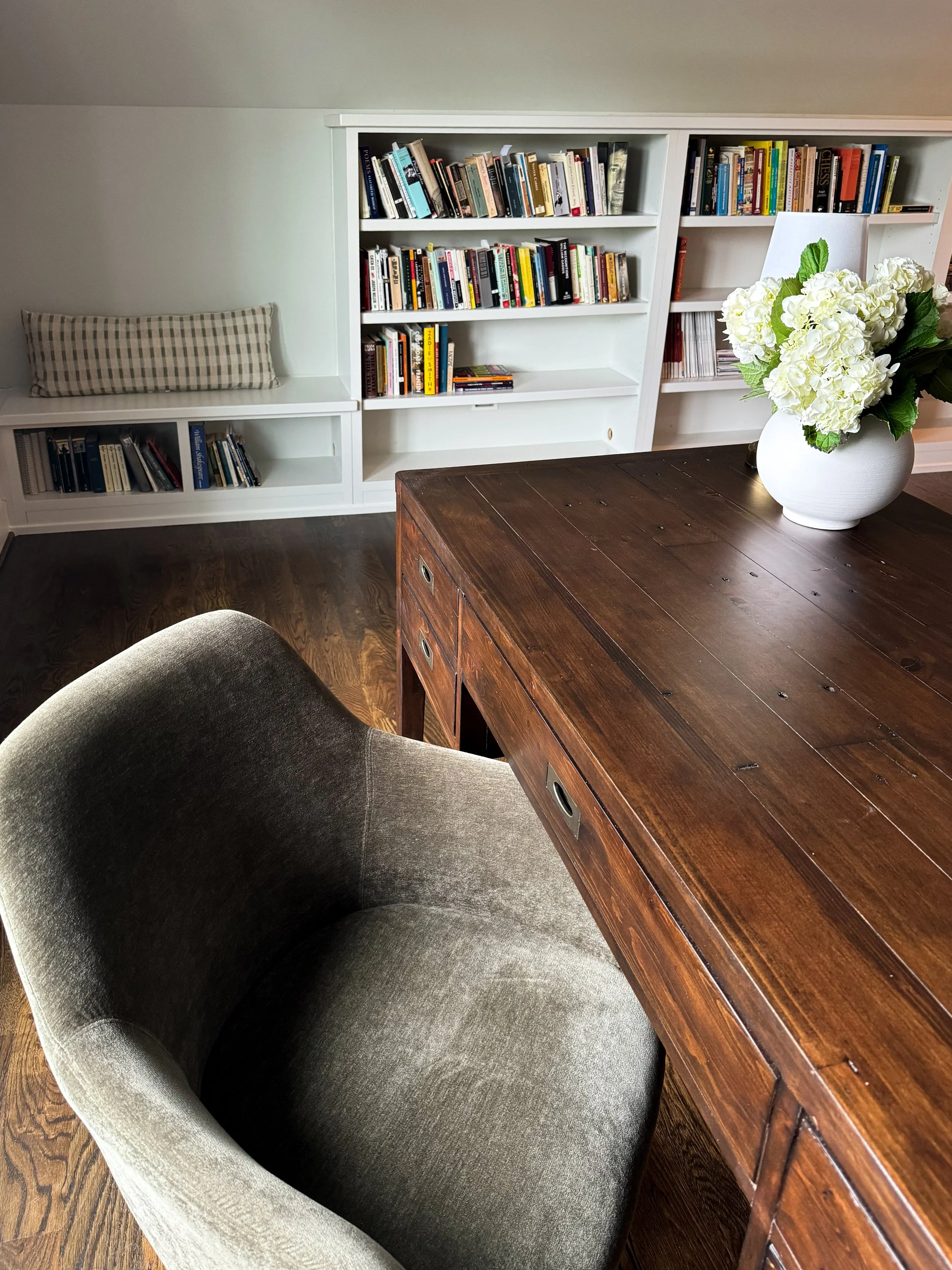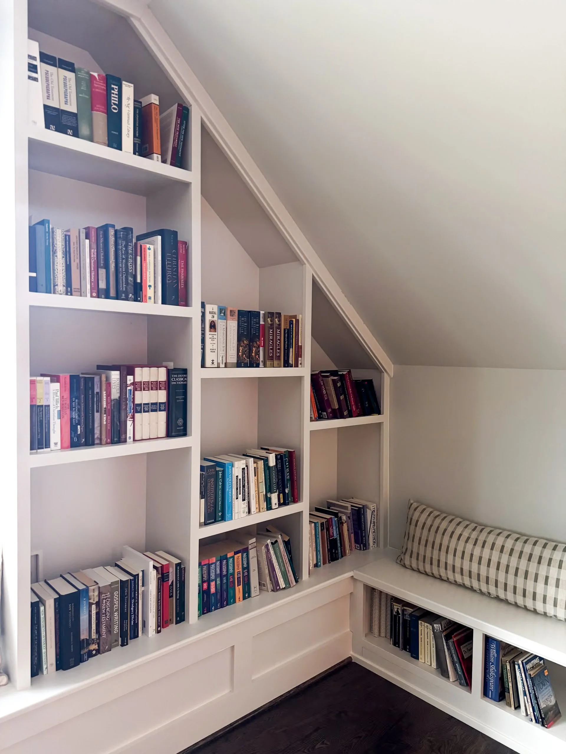 TURNING A STORAGE ROOM INTO A GORGEOUS HOME OFFICE AND STUDYThis loft home office and reading nook is a stunning transformation in both function and design. Originally used as storage, this unused upstairs space was completely reimagined into a warm and welcoming study filled with custom floor-to-ceiling shelving, gorgeous hardwood flooring, and thoughtful furnishings. The client now enjoys a dedicated space to read, work, and relax.. Scroll through the before and after photos to see the dramatic change and how beautiful functionality was brought to life in this Nashville-area home.